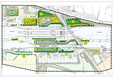 Insgesamt wurden Festsetzungen für die Neuschaffung von ca. 8.000 m² Wasser- und Feuchtbiotope sowie die Neupflanzung von ca. 135 Bäumen getroffen.