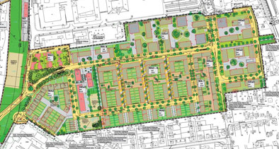 Die Straßenraumbegrünung erfolgt mit Baumreihen entlang der Erschließungsstraßen und des östlichen Fußgängerweges.