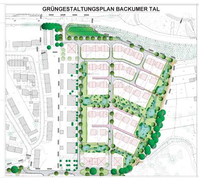 Für das Baugebiet Bebauungsplan Nr. 148 - Wohnpark Backumer Tal - 2. Änderung in Herten ist ein Grüngestaltungsplan, M 1: 500, erstellt worden, der die grünplanerischen Gestaltungsgrundsätze festlegt. Zugrunde liegt der gestalterische Ansatz, dass Thema „Wasser“ im Baugebiet sicht- und erlebbar zu machen.